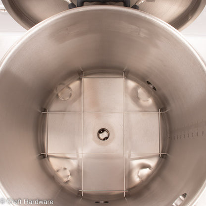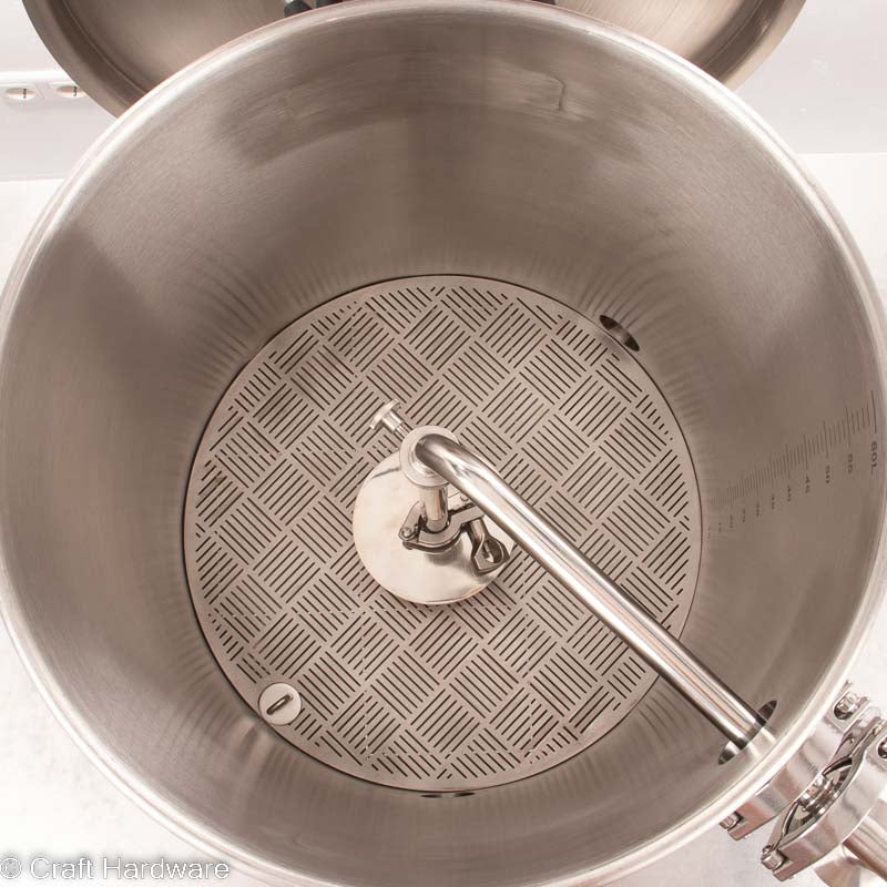 A 60L mash kettle (MLT=Mash/Lauter Tun) with bottom drain and accessories designed for three kettle, indirectly heated brewing systems (HERMS / RIMS). The mash is pump recirculated during heating through an external heat exchanger. Through recirculation and with an appropriate brew controller you can maintain the temperature of the mash and program your mash schedule.