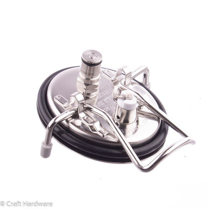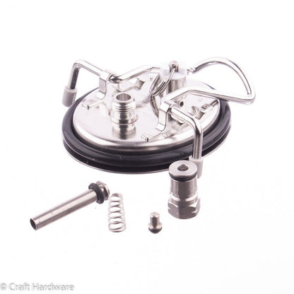 A replacement lid for NC kegs, with a keg post welded into the lid. It includes a ball lock gas post, short CO2 tube, o-ring, and pressure relief valve.