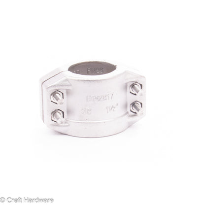 Only for smooth Tri-Clamp hose barbs with safety collar. Two-part, according to EN 14420-3, including screws and nuts.