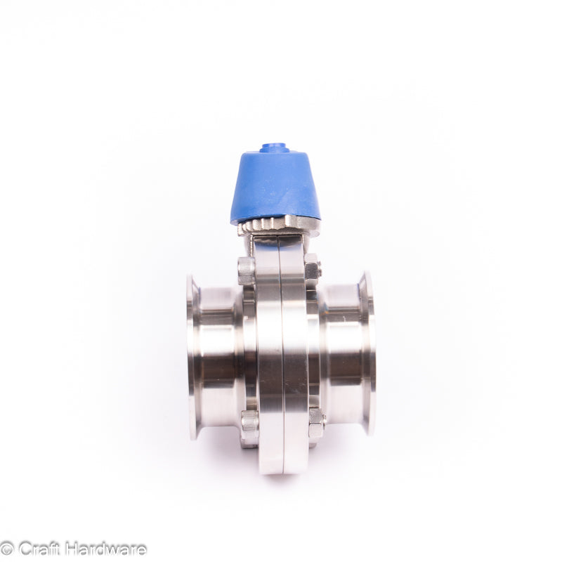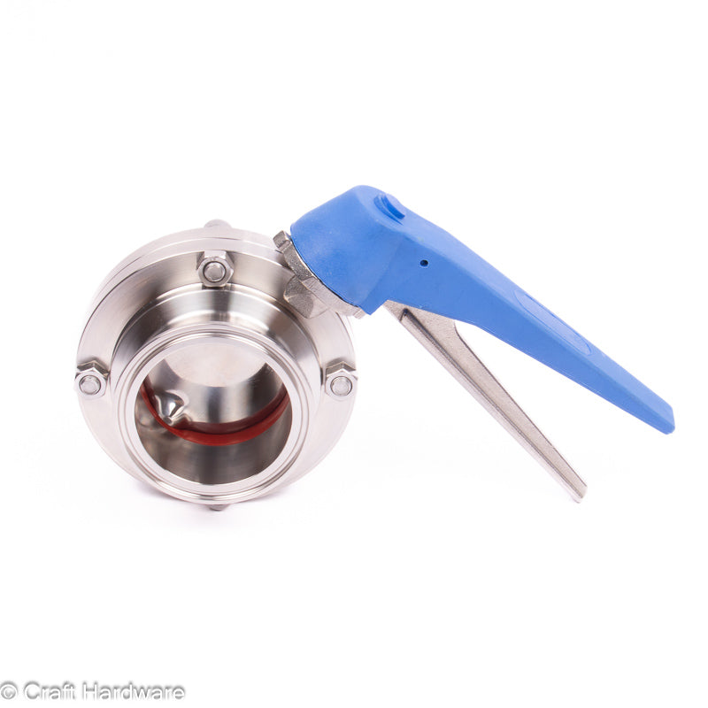 Stainless Steel 2.5" butterfly valve with blue squeeze trigger handle. The handle has a toothed lock ring which holds the handle in place until the level is squeezed to allow opening and closing.