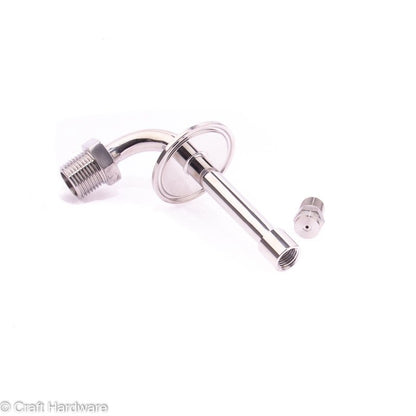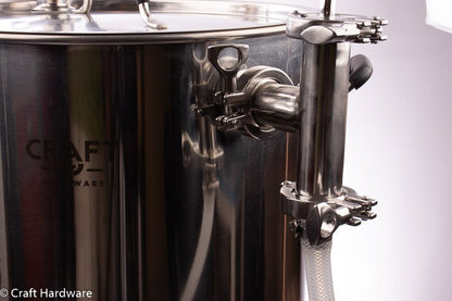 Der Kondensator wird entweder an einem 1,5" Tri-Clamp Anschluss auf der Oberseite deines Kessels (in allen unseren 2/1- und 3/1-Kesseln enthalten) oder alternativ am Deckel deines Kessels befestigt, indem du ein Loch bohrst und unseren Deckelfassung montiert. Du kannst auch einen Ersatzdeckel mit angeschweißtem Tri-Clamp-Anschluss kaufen und den Kondensator mit einem 90-Grad-DN40-Bogen anschließen.
