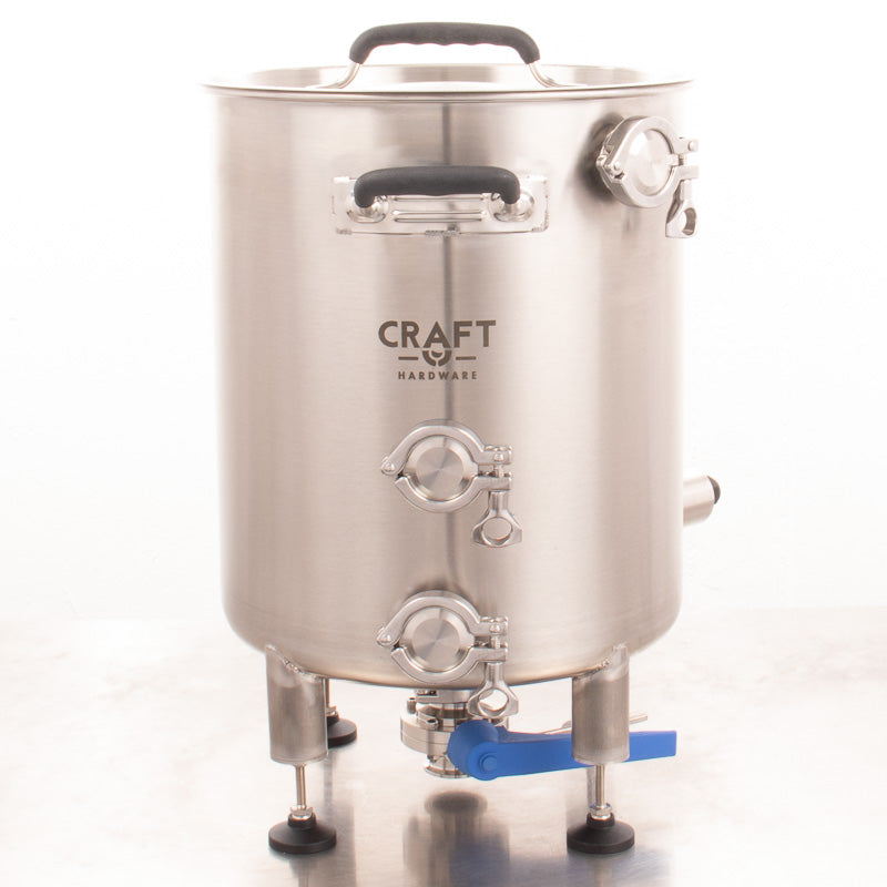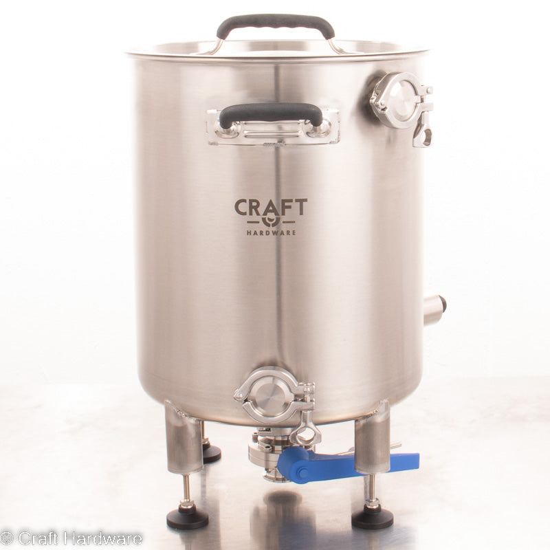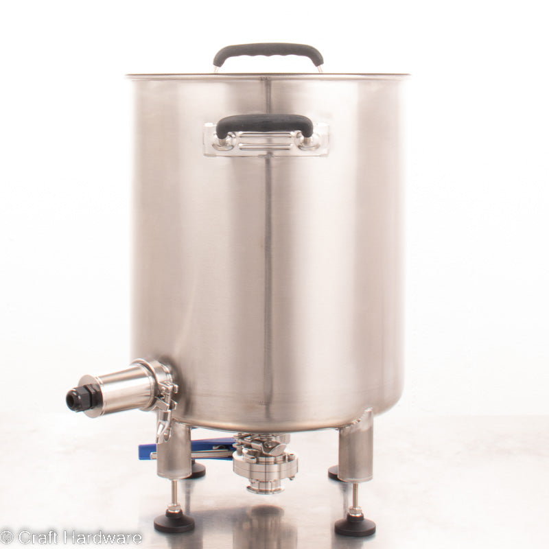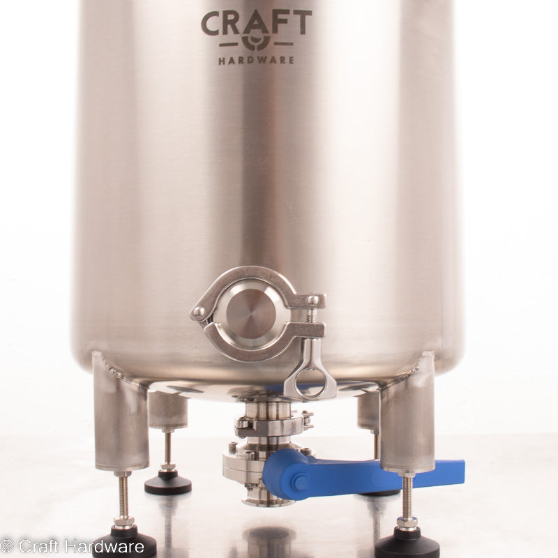Für die Umwälzung oder entleeren vom unteren Tri-Clamp Stutzen brauchst du Zugang zur unteren Öffnung. Wenn du einen normalen Tisch als Brauständer verwendest, kannst du das mit den 14 cm langen Beinverlängerungen (separat erhältlich) problemlos realisieren. Bitte beachte, dass 80-90 cm hohe Tische zu hoch sein können, um den Kessel bequem zu bedienen. Alternativ kannst du den Kessel mit unseren 45- oder 65-cm-Beinverlängerungen und Fußplatten direkt auf den Boden schrauben. Mit einer Pumpenhalterung kannst du die Pumpe an den Beinen des Kessels befestigen. Du kannst auch deinen eigenen Brauständer aus Aluminiumprofilen bauen oder einen hochwertigen Brauständer von Craft Hardware aus dem Shop wählen.