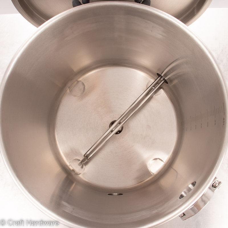 Ein 40L Kochkessel Set mit Bodenablauf, in einer Basisversion, die du mit allen Zubehörteilen erweitern kannst, die du für die von dir gewünschten Funktionen brauchst. Du entscheidest, wie du den Kessel entleeren willst, welche Art von Brauständer du verwenden willst und ob du Kesselbeinverlängerungen oder anderes Zubehör wie eine Pumpe, einen Whirlpoolarm, oder Dampfkondensator hinzufügen willst. Im Shop findest du alles, was du brauchst, um deine Wunsch-Brauanlage komplett zusammenzustellen.