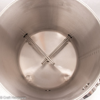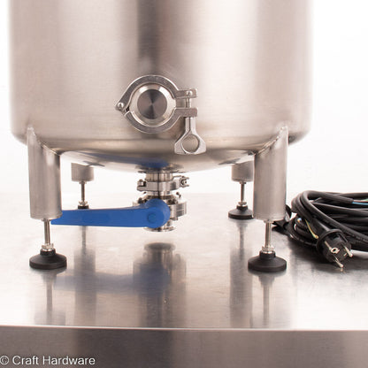 Für die Umwälzung oder entleeren vom unteren Tri-Clamp Stutzen brauchst du Zugang zur unteren Öffnung. Wenn du einen normalen Tisch als Brauständer verwendest, kannst du das mit den 14 cm langen Beinverlängerungen (separat erhältlich) problemlos realisieren. Bitte beachte, dass 80-90 cm hohe Tische zu hoch sein können, um den Kessel bequem zu bedienen. Alternativ kannst du den Kessel mit unseren 45- oder 65-cm-Beinverlängerungen und Fußplatten direkt auf den Boden schrauben. Mit einer Pumpenhalterung kannst du die Pumpe an den Beinen des Kessels befestigen. Du kannst auch deinen eigenen Brauständer aus Aluminiumprofilen bauen oder einen hochwertigen Brauständer von Craft Hardware aus dem Shop wählen.