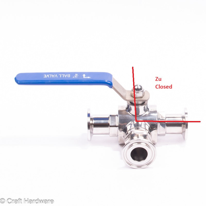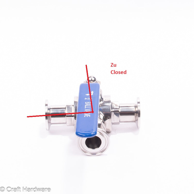 Dieser 3-Wege-Kugelhahn ist L-gebohrt und die Kugel dreht sich um 360 Grad, was drei verschiedene Betriebspositionen ermöglicht. Bitte achte darauf, dass die möglichen Positionen für deine Anwendung geeignet sind. Bei einem L-Ventil ist der Flüssigkeitseintritt in der Regel der mittlere Schenkel und der Ausgang auf beiden Seiten. Vergewissere dich, dass du genug Spielraum hast, um den Griff ganz herumzudrehen; manche Fittings können den normalen Betrieb behindern.