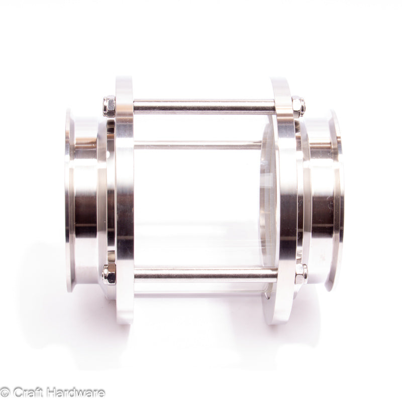 Ein Tri-Clamp Schauglas mit Borosilikatglasrohr mit 4" Tri-Clamp-Endstücken (97,4 mm ID). Dies ist ein hochwertiges Schauglas mit Distanzstangen zwischen den beiden Flanschen für einen perfekten Zusammenbau.